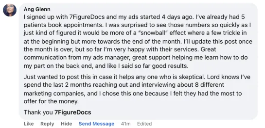 "Working with Seven Figure Docs has been incredible; I've seen more new patients in my first week than in three months combined, and my patient numbers have since doubled weekly thanks to their unwavering support!"