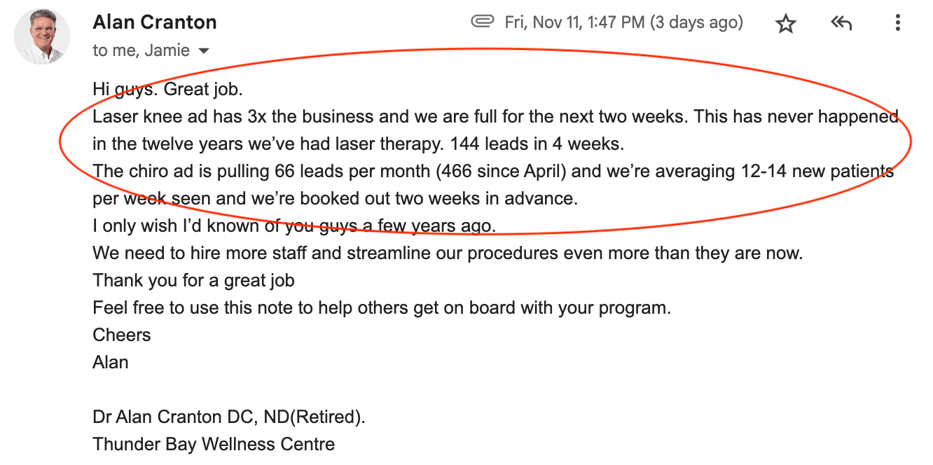 "consistently delivered enormous leads over the years, and their impeccable customer service makes me feel valued and supported as a chiropractor."