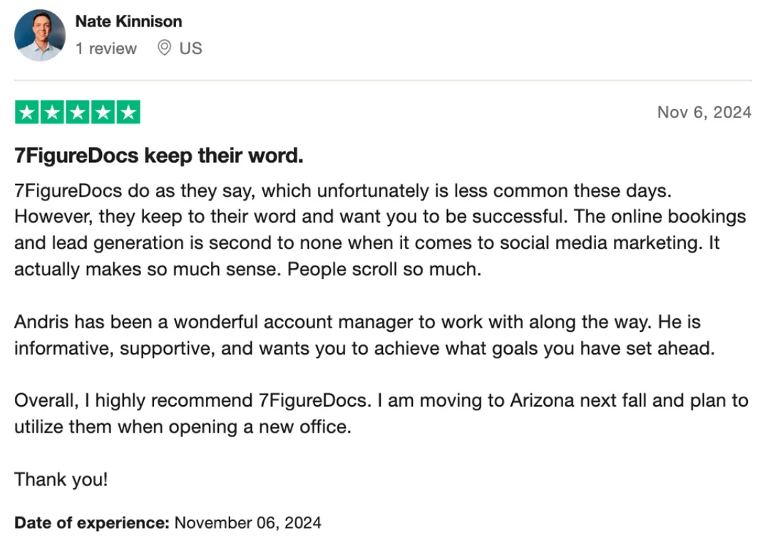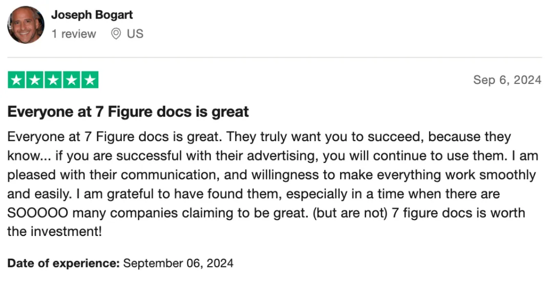 "After 3 to 4 months with Seven Figure Docs, we've consistently received a handful of leads that enable us to gain new customers, and the proactive communication from our account manager has made us very happy—looking forward to continued success together!"