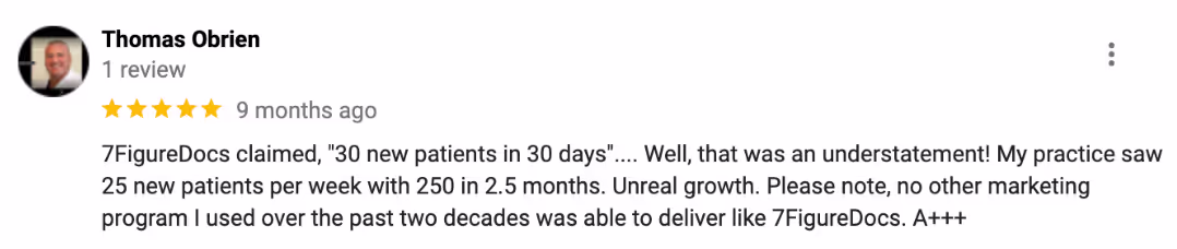 "After just thirty days with Seven Figure Docs, I was amazed by the high number of new patients and excellent retention as I grow my practice in a new area—highly recommended!"